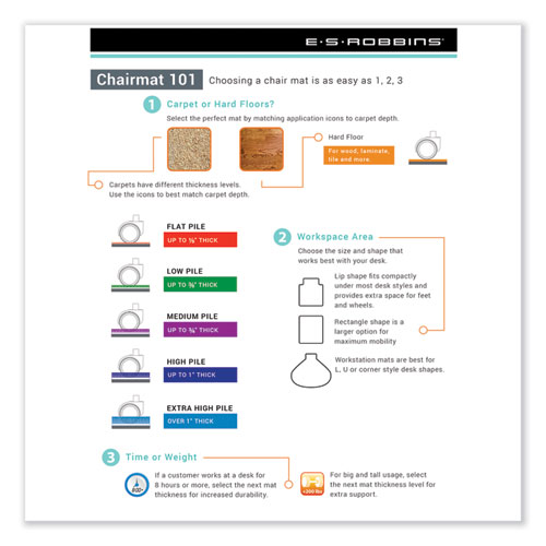 - Protects laminate, wood, tile, carpet and other floor surfaces from caster wear and tear.