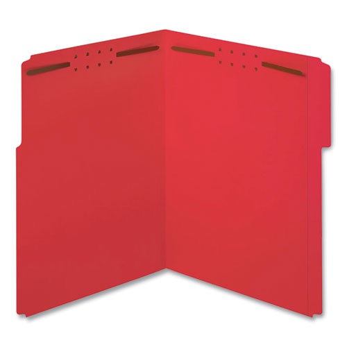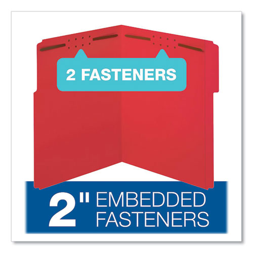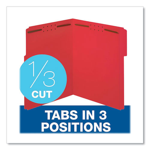 Fastener folders keep your documents safe and secure, and the vibrant color makes your files visible and easy to organize. You can also use these fastener folders to subdivide within the folders and keep documents in sequential order. Front and back covers include two 2" embedded fasteners in positions No. 1 and 3. Reinforced top tabs with an undercut score on the front cover provide room for labels or handwritten titles. Tabs are 1/3 cut in assorted positions. Fastener folders hold letter-size documents and are made of 11 point colored stock.