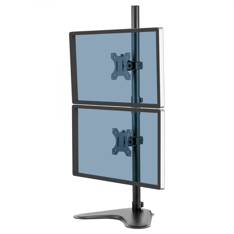 The Fellowes Professional Series monitor arm has a free-standing, stacking design for 2 monitors. The portable design can be used without the need for a clamp or grommet mount.